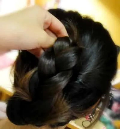 步骤五:麻花辫编好后,拿起发尾,将发尾放到之前拧好的上部分的马尾上的洞里面。