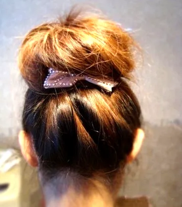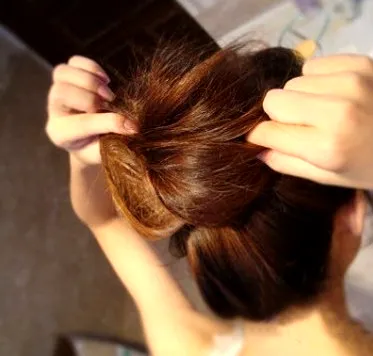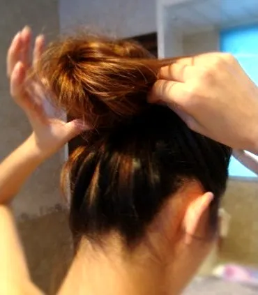 步骤七:然后将绕剩的发尾塞到皮筋里面,再用黑色发夹固定。