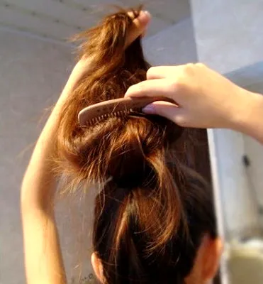 步骤三:从马尾中拿起一缕头发,用梳子倒梳刮毛弄蓬松。