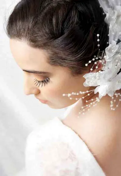 小编点评:长刘海的MM们是不是觉得中分或者修刘海很枯燥无趣了,那么小编告诉大家,可以将头顶的长发全部梳直一侧,然后才用续发的方式进行编发,将发尾在右侧的额角盘起来,给人感觉十分烂漫唯美很有森系的风格。