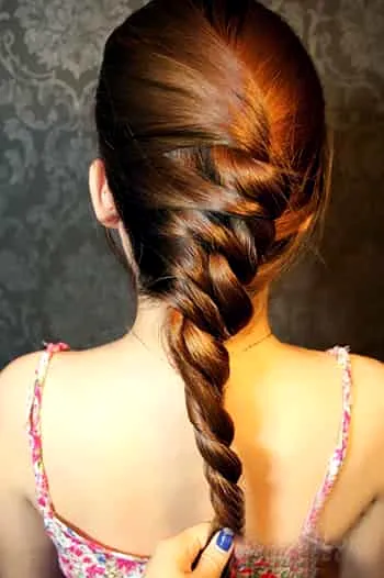 步骤四:接着将右手取出一股头发与其中一股合并。注意头发要抓紧不要散落了!