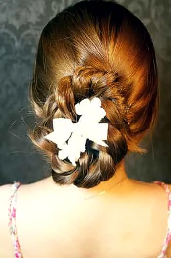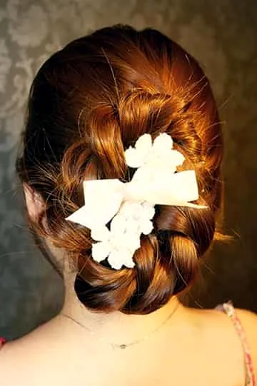 步骤九:最后,再佩戴好看的发饰,就完成了。这款编盘发发型,让你立刻变身气质淑女哦!赶紧试试吧!
