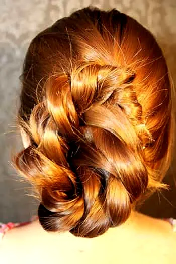 步骤六:这一步就是盘发了。将编好的发辫沿着中心点,绕一圈,把发尾藏进发辫中去。
