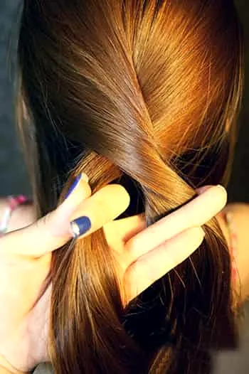 步骤三:在互叠两次后,从左手取出一股头发与其中一股合并。如图所示。