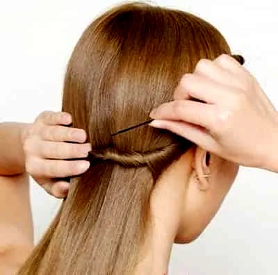 步骤4:在从相反的方向,将耳后下方的头发,用拧转的方式,固定住一股发丝。