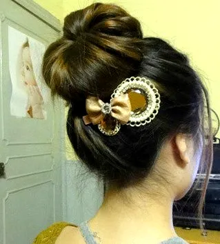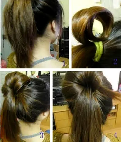 步骤2:然后从马尾中挑出一束头发,将头发往内卷,然后用发夹固定住,如图示。