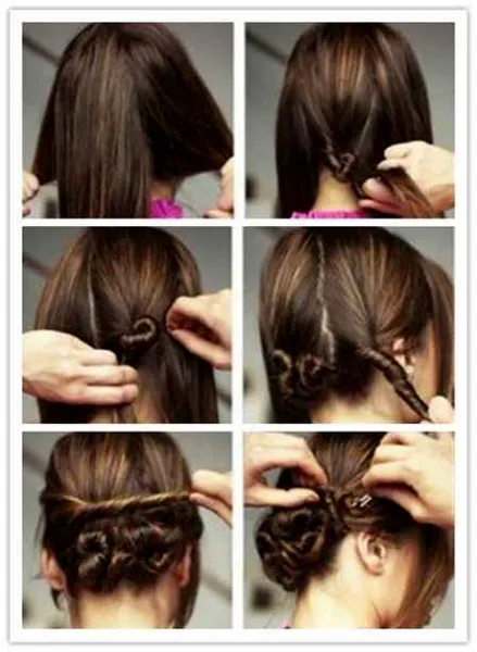 步骤3:将扭转后的发束用发夹固定好,余下的的发尾继续顺时针扭转,然后固定。