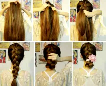 步骤四:把发辫编至脖子处时,把剩下的头发又恢复到最简单的麻花辫编法一直向下编,按照之前的方法,把所有的头发都编好后,用皮筋把发尾处固定起来。