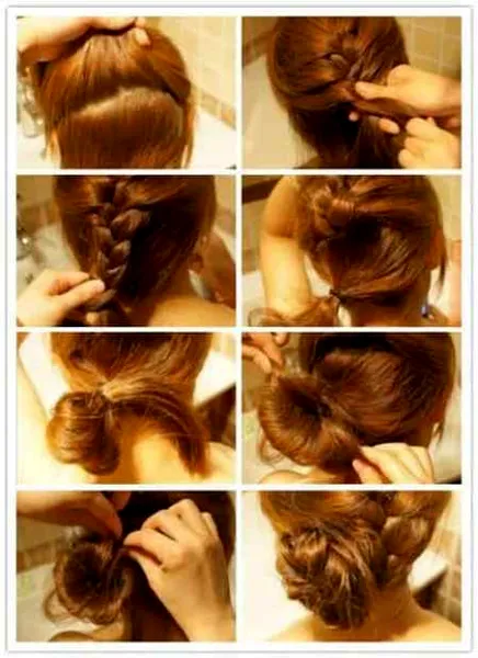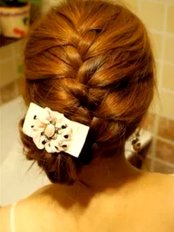步骤8:然后将编好的蜈蚣辫下放,缠绕住下半部分的花苞。再用发夹固定发型。