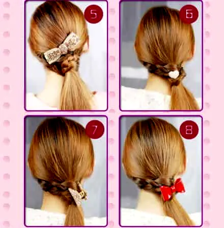 Step2:将辫子缠绕在发束上,用夹子固定好。可以挑选下大红色的蝴蝶结,比较亮眼,而粉红色的比较淑女,可以随自己的喜好挑选发饰,而且能够发饰百搭哟!