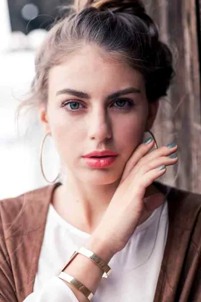 这款发型适合没有刘海的姑娘们,只需要将长发轻轻扎好,将刘海制造出一点点弧度的感觉,自然的打造掉落的鬓发,将所有优雅的挽在耳朵后面,就能展现出随性之感。