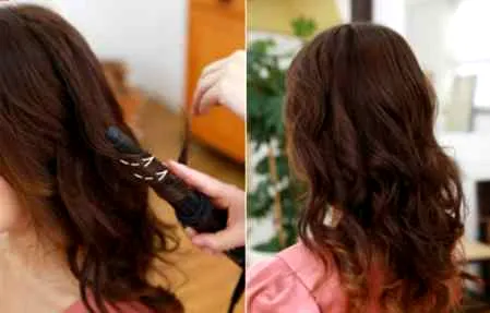 step1:将长发用卷发棒向外卷曲,最后打造成右图中的波浪卷发。