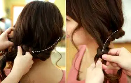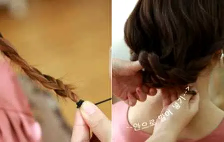 step5:将发束一直编到发尾处,用橡皮筋固定后拉扯到脑后盘起。
