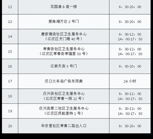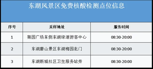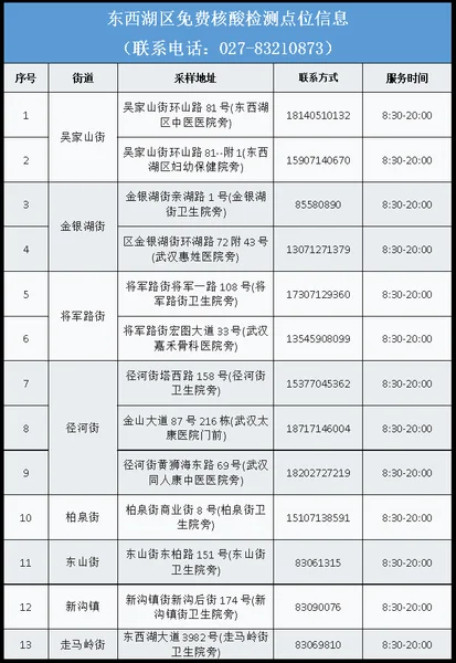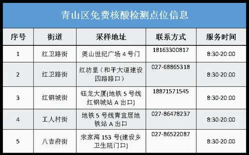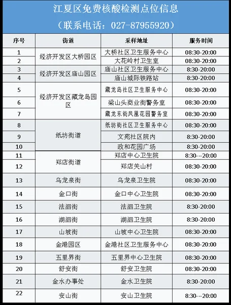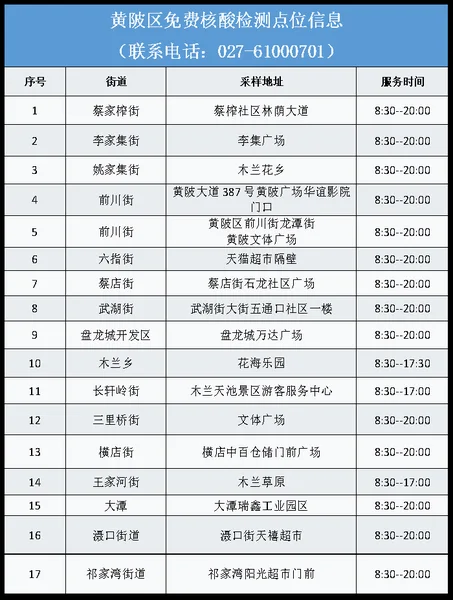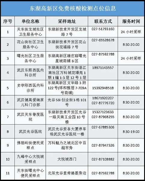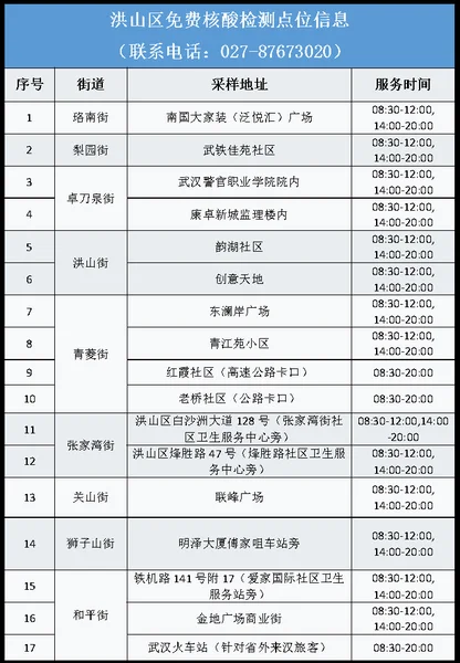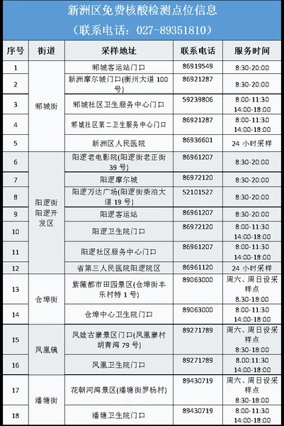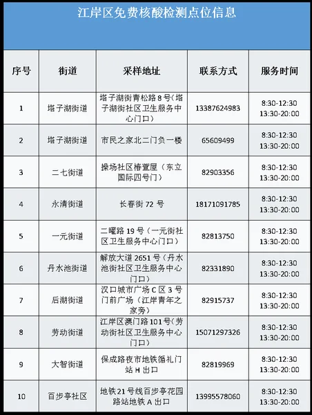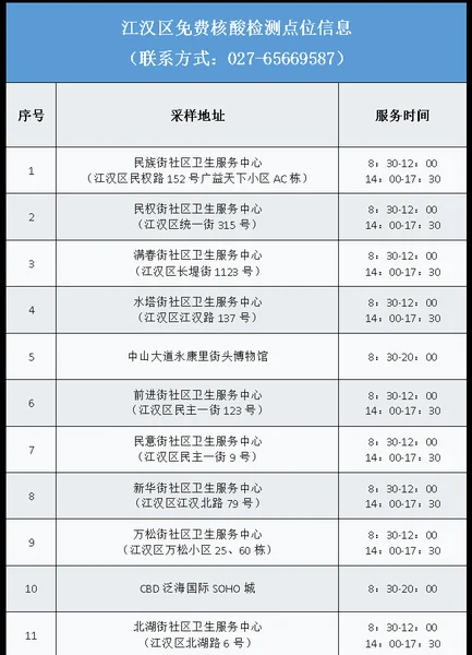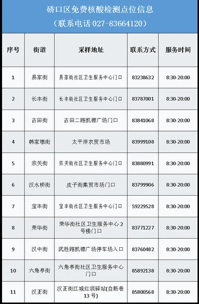 从武汉市获悉,该区为进一步加强常态化疫情防控,方便广大市民核酸检测,即日起为广大市民提供免费核酸检测服务,该区便民核酸采样点位及开放时间如下:
