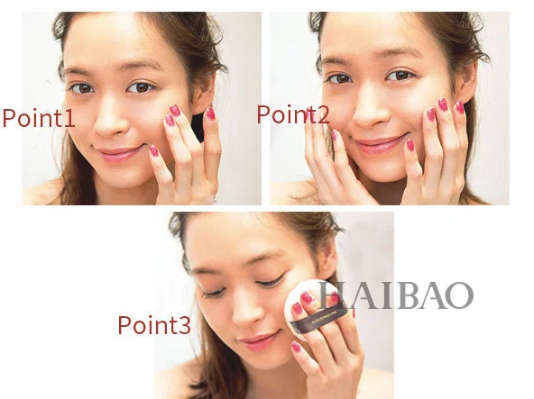 Point1 把粉底液挤到手背,用指腹点在额头和脸颊,再均匀地抹开。